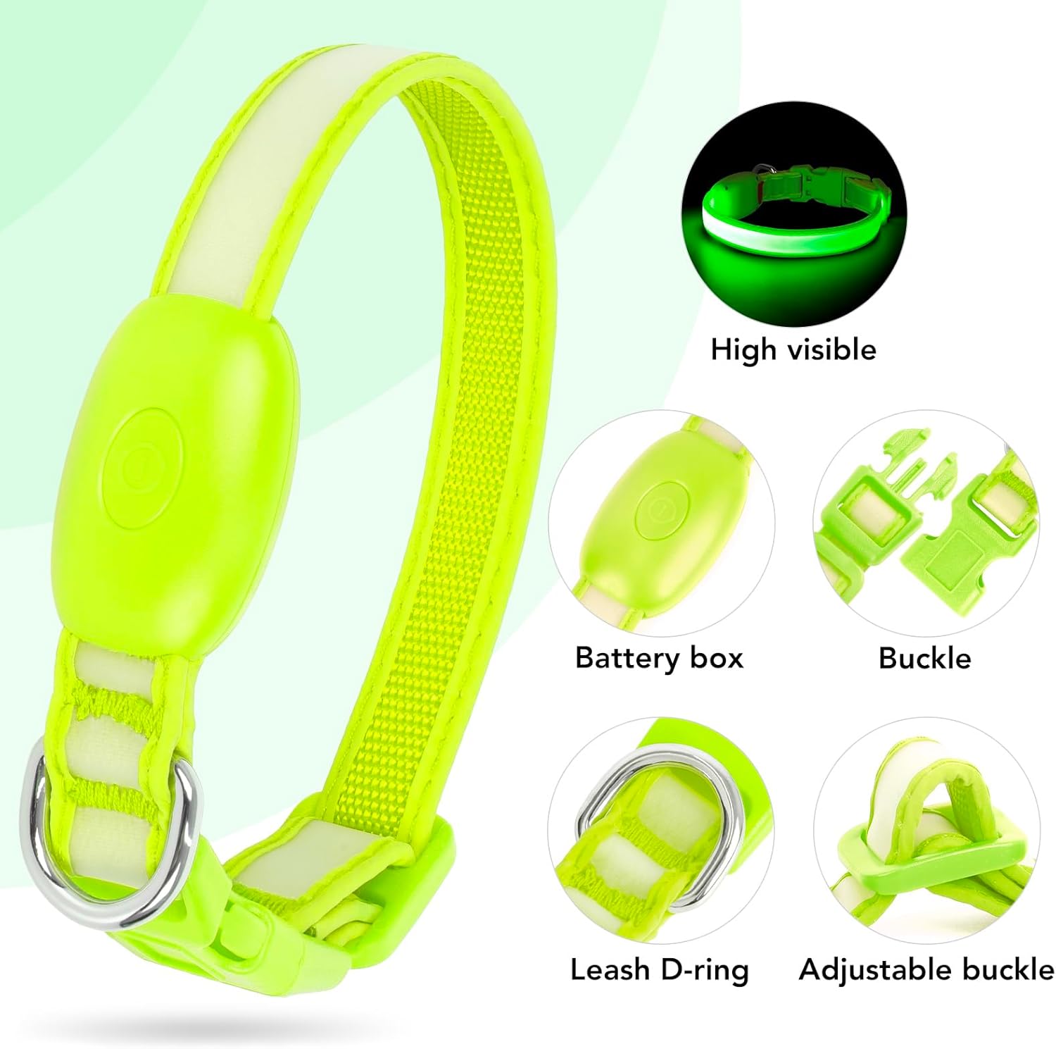 6 color : Green, Blue, Orange, Red,Pink, Purple .You can choose the color according to your favorite and pet personality.Vizpet Nylon led Dog Collar with high quality flat optical fibers makes your dog for great identification and safety around the 500 meters. No more worries about the dog safety.2 Mode Lights:Fash Glowing- Steady Glowing. When the collar is fully charged, it can be used for 8-12 hours for fash Glowing, and 6-8hours of steady glow . Each mode has applicable scenarios, which can make your pets safer at night and give you more peace of mind.Our usb-rechargeable led dog collar with 140 mah battery, fulled charged 2hs.